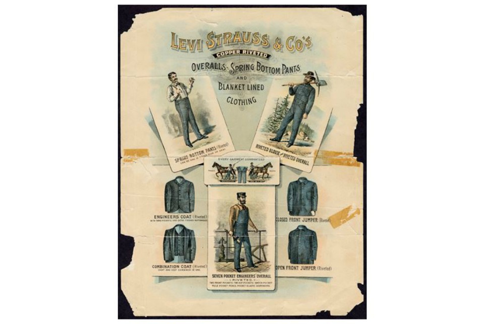 In 1889, LS&Co. launched a new product called Spring Bottom Pants. Research reveals that “spring” meant “flare,” and custom tailors would “cut more or less spring as desired.” It was a popular style in the late 19th century, and we decided to make our Spring Bottom Pants in blue-and-gold denim. They had the famous copper rivets, just like our 501® jeans, but these pants weren’t meant for laborers. They were advertised to workers such as bookkeepers and factory superintendents — jeans for middle management. By the turn of the century we were making them in black denim, as well.