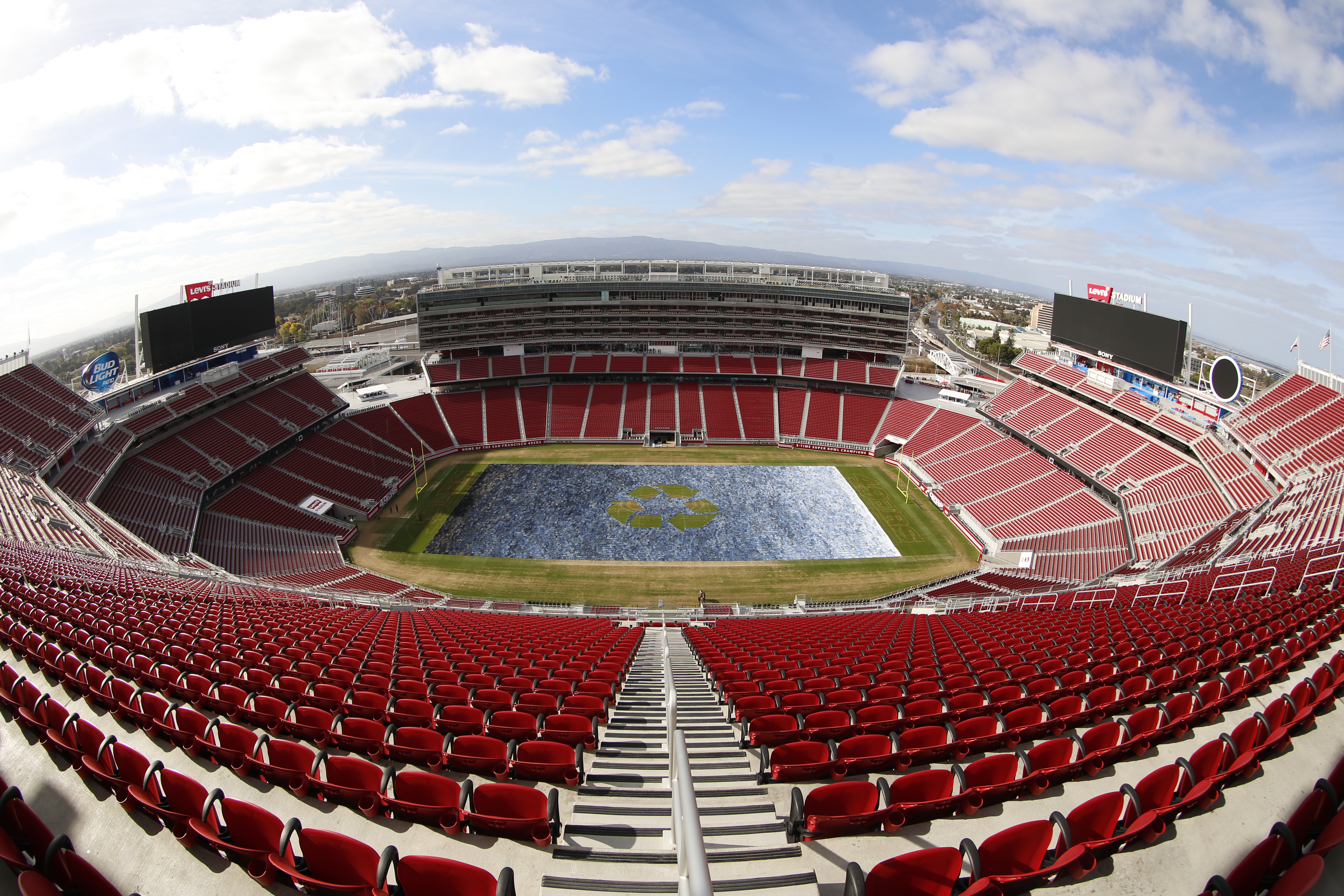 The massive art installation covered the entire field of Levi’s Stadium with the donated jeans. The center of the piece used the negative space of the green field to form the recycling symbol, which can be clearly seen from an aerial perspective.