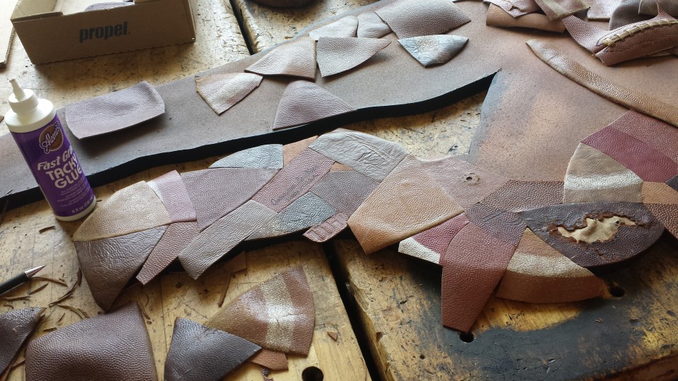 Another piece that I worked on was a six-foot running back silhouette. I took antique worn-out leather footballs that would have been thrown out and cut them in such a way that I could mosaic with the leather. The wear really told the story — like the tear on the football player’s knee where one of the balls was literally worn through.