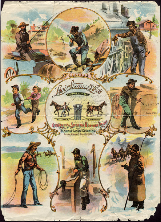 Riveted denim waist overalls — today’s blue jeans — were first manufactured by Levi Strauss & Co. in 1873 and would have been an obvious garment choice for men at the quarry. Hard-wearing Levi’s® pants matched, in strength, the tough and often back breaking efforts of the workers. The waist overalls were marketed to working men, from carpenters and cowboys to miners. LS&Co. distributed its products throughout the 11 Western states and into the Pacific Rim, even publishing flyers in Portuguese, Spanish and Chinese in the 1920s.