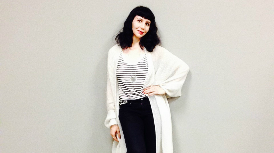 Black skinny jeans, black booties or heels, white V-neck tee, red lips and nails, and sometimes a unique or vintage piece of jewelry.