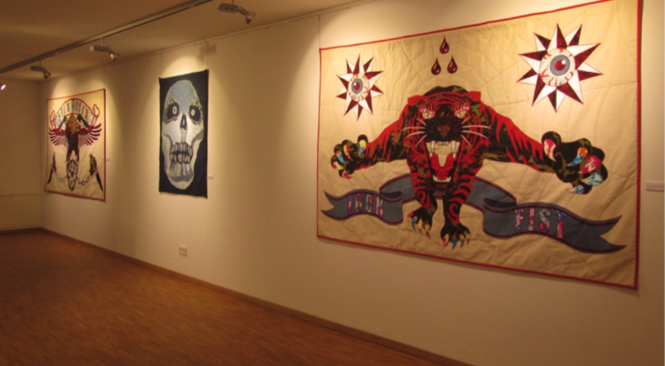 In his pieces, San Francisco artist Ben Venom combines the traditional craft of quilting, usually associated with grandmothers’ sewing circle, with extreme elements. Soft textiles meet hard motifs as the pieces contrast the counterculture elements of gangs and metal music with the comforts of domesticity. Hereby, the fringes of society, with their sometimes extreme elements, work their way into everyday culture. The emerging themes resemble those of classical tattoos and biker’s vests, and are influenced by the occult, folklore, mythology and gang insignias.