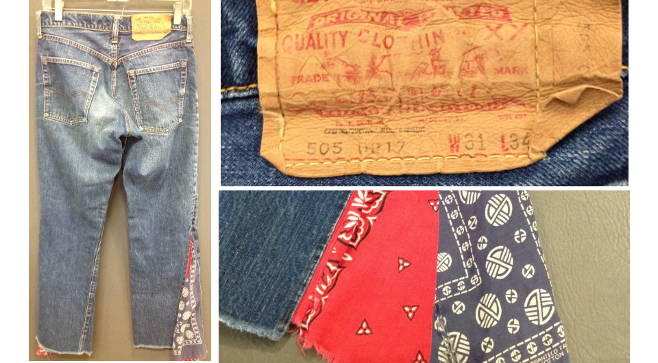 “The red tab has the capital ‘E’,” Darla wrote me. The jeans had been modified into flares using red and blue bandannas. Darla’s daughter flagged the jeans as special, but they ended up among the Halloween items.