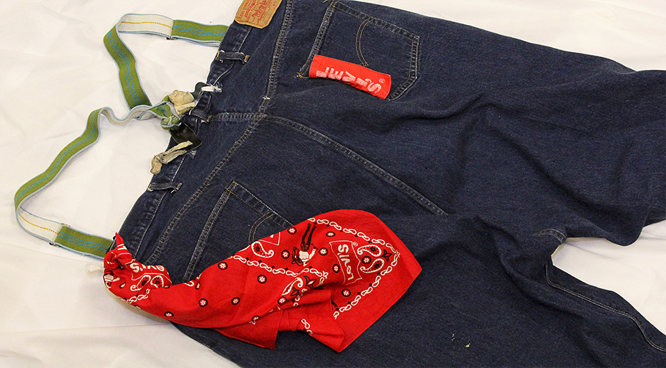 In the 1970s, Levi Strauss & Co. fashioned a singular pair of jeans for George. The denim duds were oversized and baggy with an enormous Red tab featuring LEVIS in all capital letters. To keep the loose-fitting jeans from slipping, George fitted the Levi’s® jeans with green suspenders and tied colorful bandanas to the waistband. The bright scarves may also have distracted the bulls.
