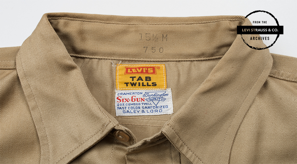 Levi’s® Tab Twills yellow label Men’s shirt Six-Gun label Cramerton Burlington 6 oz combed twill Sanforized sold by Gayley & Lord khaki color circa 1958.