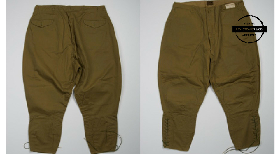 Grandpa’s pants remind me of several pairs of khakis in the Levi Strauss & Co. Archives. Full at the top with lace-ups near the bottom. They are a heavy weight with double seat reinforcement and a beautiful Levi Strauss Make label—Lot 5038.