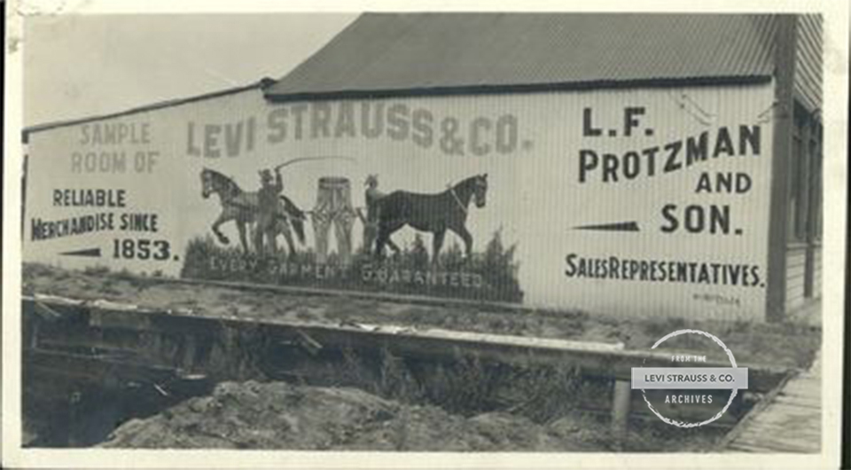 Photographs in the LS&Co. Archives depict other painted building signs from the same period. One remarkable image features a sign painted from a merchant in faraway Alaska, another location where the company sold its products. LS&Co.’s famous two-horse trademark reminded customers of the strength of the riveted pants that could not be torn apart.