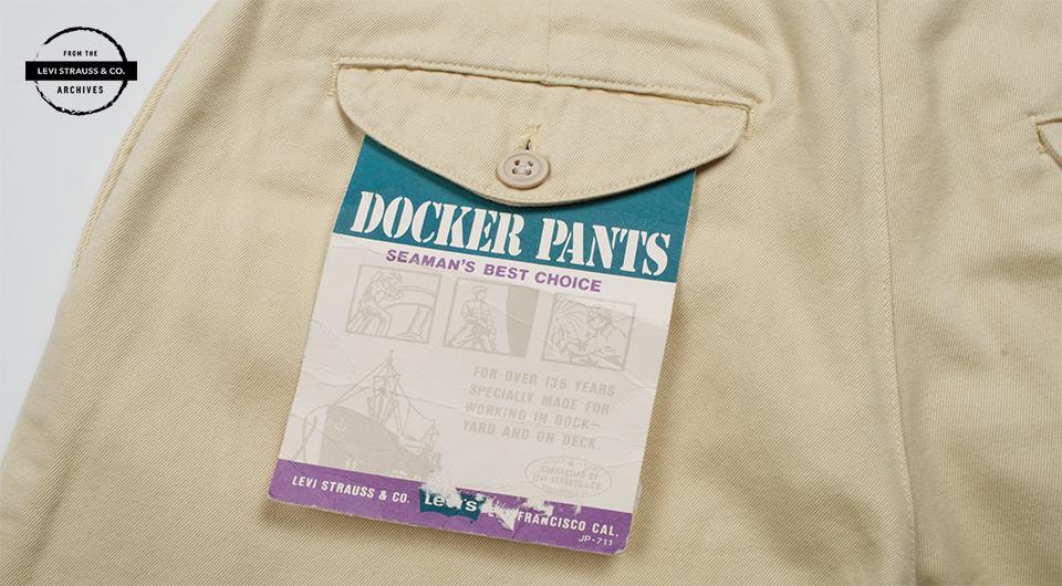 Around 1982, a Levi Strauss & Co. factory in Argentina developed a line of “nautically inspired” fashion jeans, which they named “Dockers,” a nod to the English term for longshoremen. By 1985, Levi Strauss Japan adopted the same name but with one minor adjustment – they dropped the “s” and called the non-denim trousers, “Docker Pants,” also adopting a wing and anchor logo.