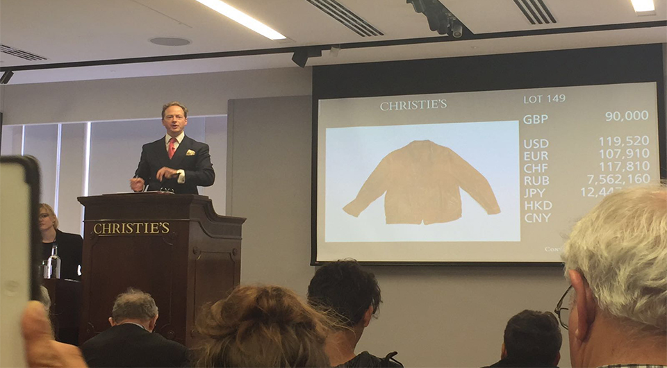 I arranged a preview of the jacket with Thomas the day before the auction. This was my first visit to Christie’s on King Street near Oxford Circus. Inside felt like a stately residence. I was immediately drawn to an exhibit of artwork Christie’s had auctioned off over its impressive history—pieces from Holbein to Damien Hirst.