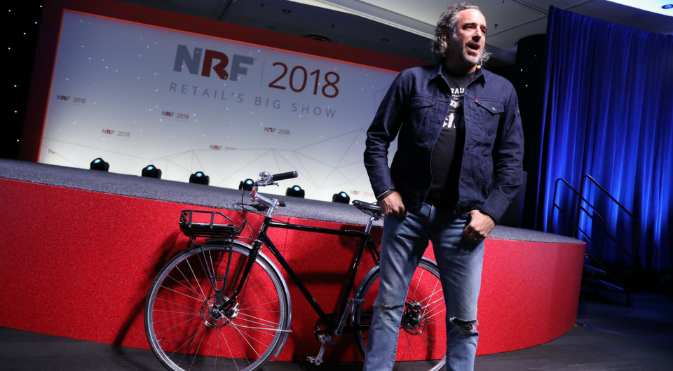 Levi’s® Brand President James ‘JC’ Curleigh made quite the entrance at this year’s NRF 2018: Retail’s Big Show event, literally cruising to the stage by bicycle as he worked his Levi’s® Commuter™ Trucker Jacket with Jacquard™ by Google.