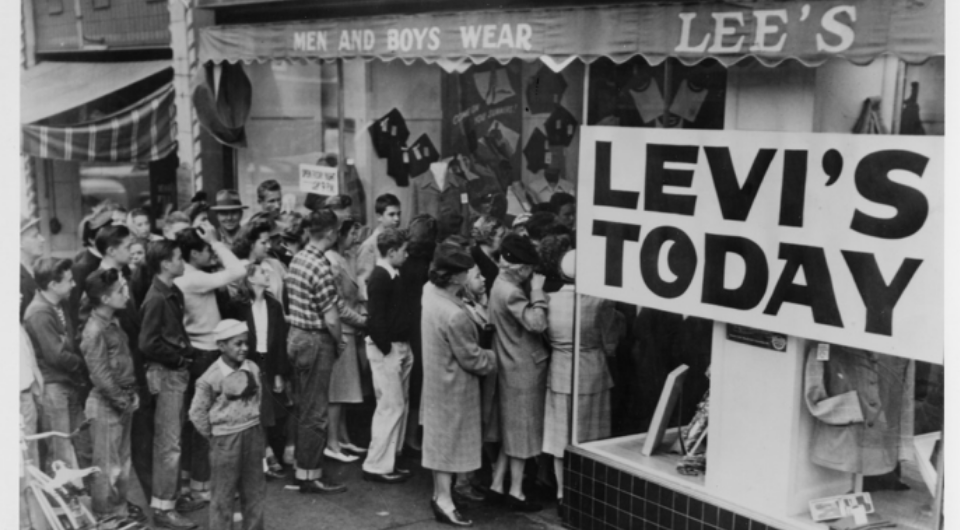 During World War II, shortages from rationing forced eager customers to line up at some LS&Co. retailers for their favorite Levi’s® clothes. In Berkeley, California, Lee’s, one of many menswear shops that stocked Levi’s® products during the decade, managed lines that ran down the street. For Sneible & Tavernetti Co. in Gonzales, California, Levi’s® customers were encouraged in advertisements to “Buy War Bonds.”