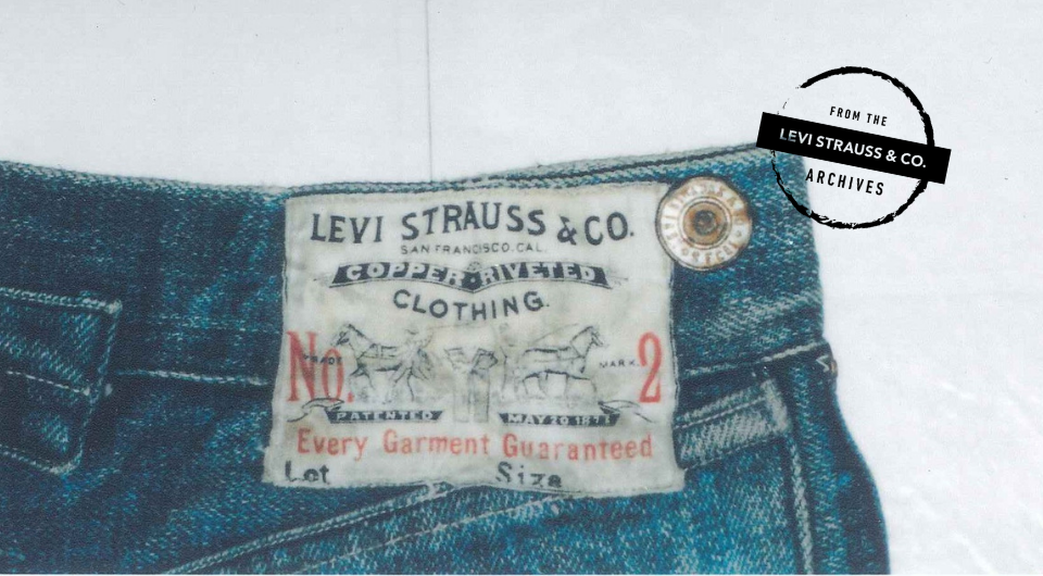 The found Levi’s® pants were worn by Klondike miners. They represent the two types of riveted waist overalls that LS&Co. originally sold: duck and denim. The white cloth label of the denim pants featured the Levi Strauss & Co. name, Two Horse Trademark, and a printed red “No. 2” that identified lot number 201. Eventually, the denim became more popular among customers than the brown duck.