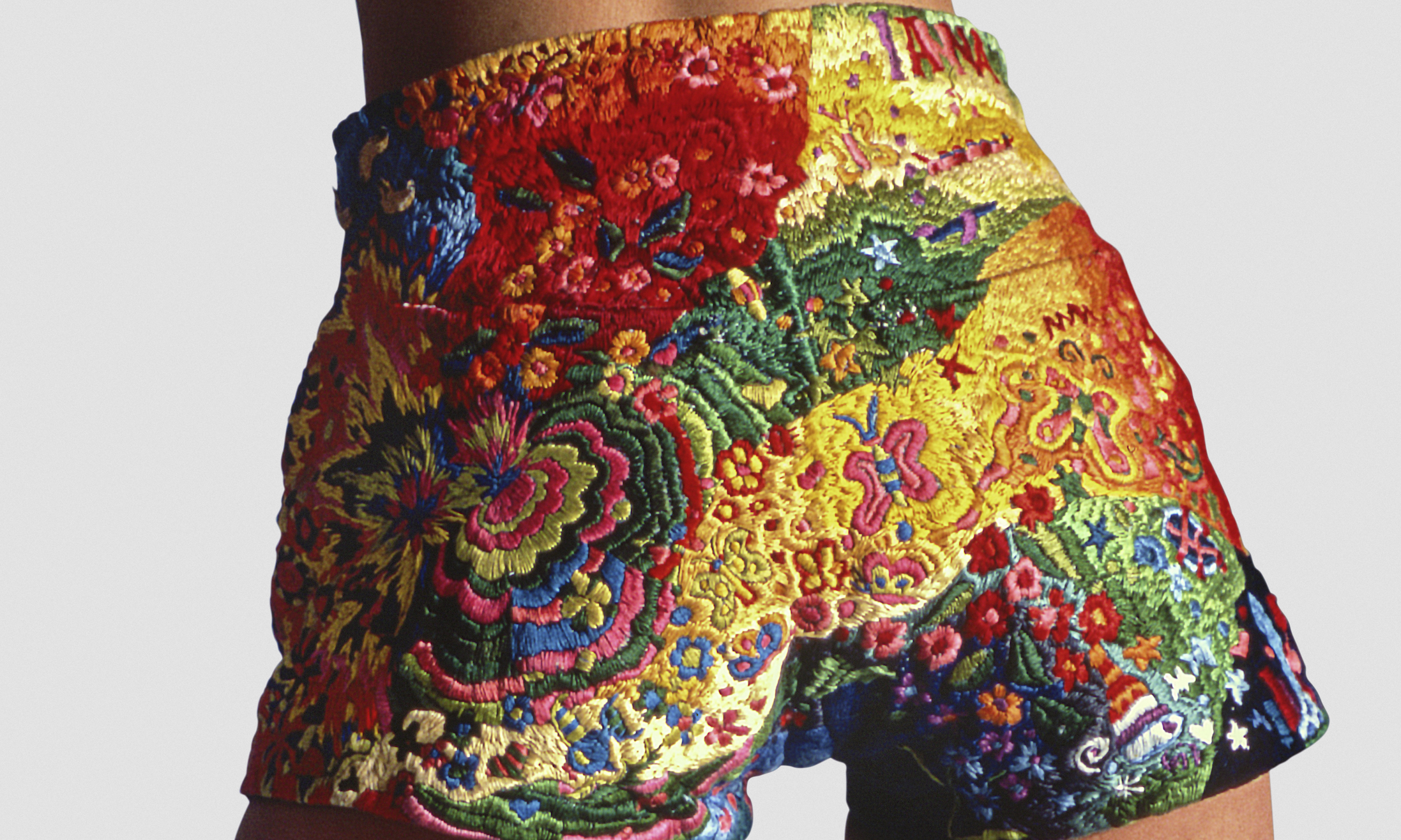 Anna’s International Levi’s® became a signature work of art. She says her cutoffs symbolize love, freedom, the exuberance of youth and her interest in color as an emerging artist. Details include a satin-stitched “IANNA” on the waistband, added “not as a narcissistic statement, but as an intertwining of my name and Ian, my boyfriend at the time,” she said. Other details include the blue Volkswagen beetle she drove, the New York skyline of her home state, flowers, stars and colorful swirls. “They are about the joy of life at that time,” Anna said.