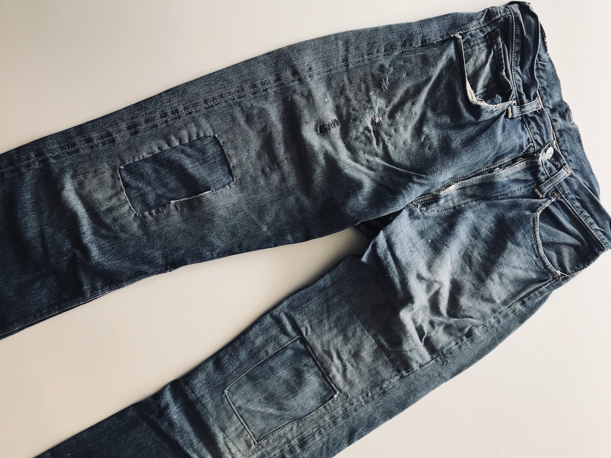 – Machine and hand-stitched repairs cover the jeans