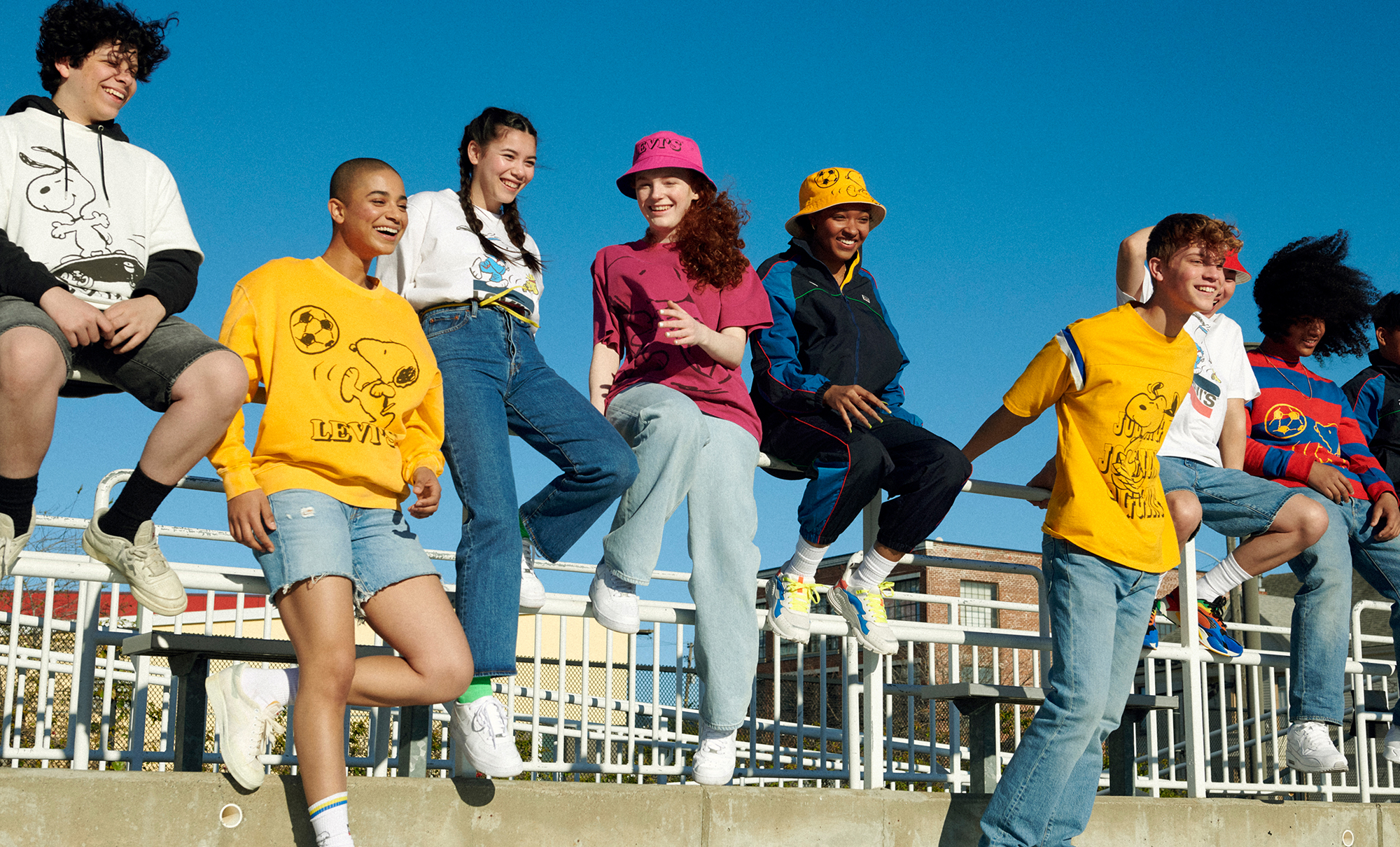 Along with the graphics, Levi’s® x Peanuts® Summer 2020 features unisex football tees, a set of reversible Snoopy graphic bucket hats and oversized crewneck sweatshirts. There’s also the iconic cobranded white logo tee, which features Snoopy racing Woodstock over the classic Levi’s® sportswear logo.