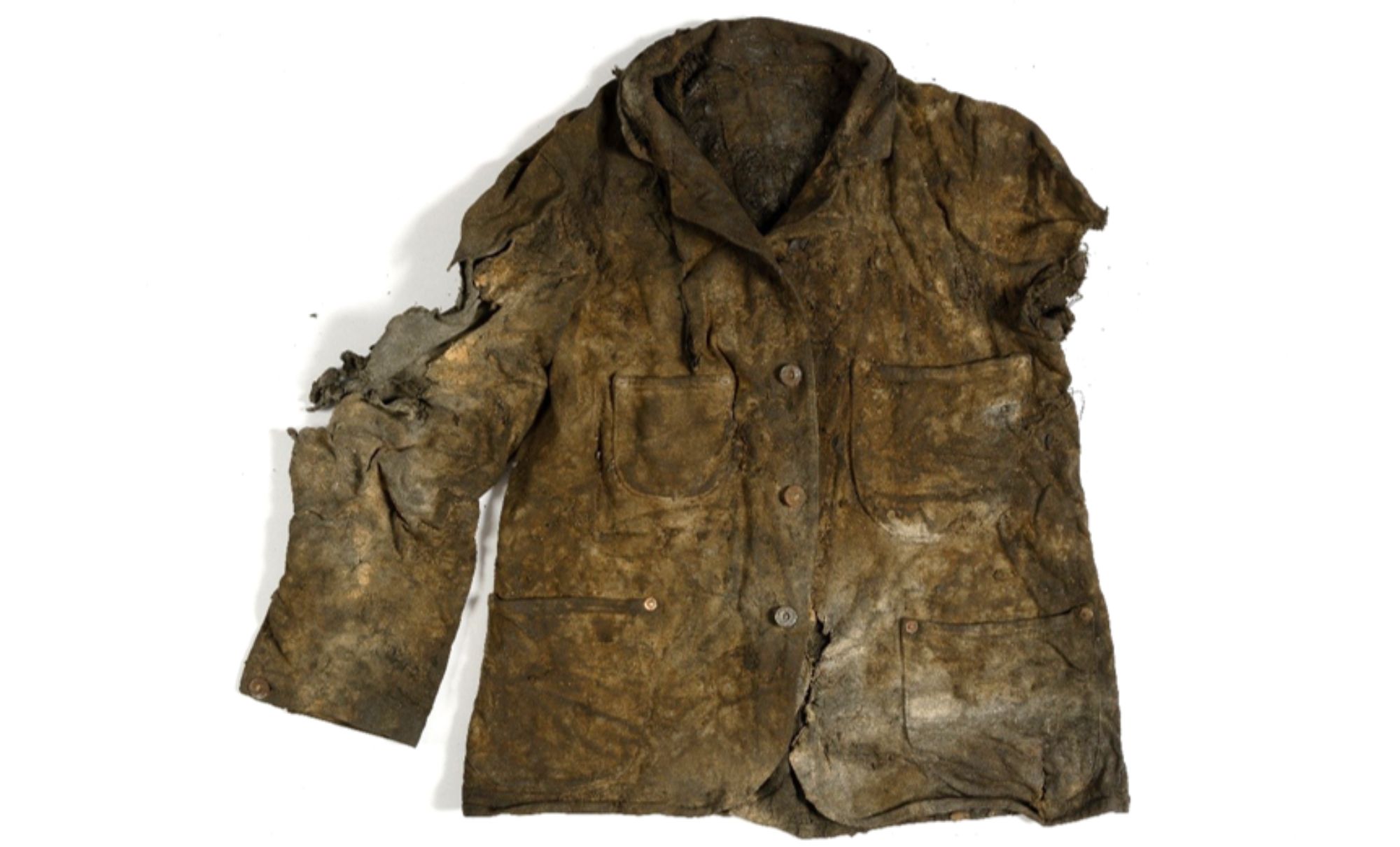 Shane took his hand pick and swung. The pick caught hold of the coat buried under layers of earth. His pick ripped the coat near the left shoulder but pulled it out of the ground. He remembered how heavy it felt. “It must [have] been used to load up tarlike-coated rocks or to soak up oil,” Shane surmised. “I’m sure that’s what helped it survive.”