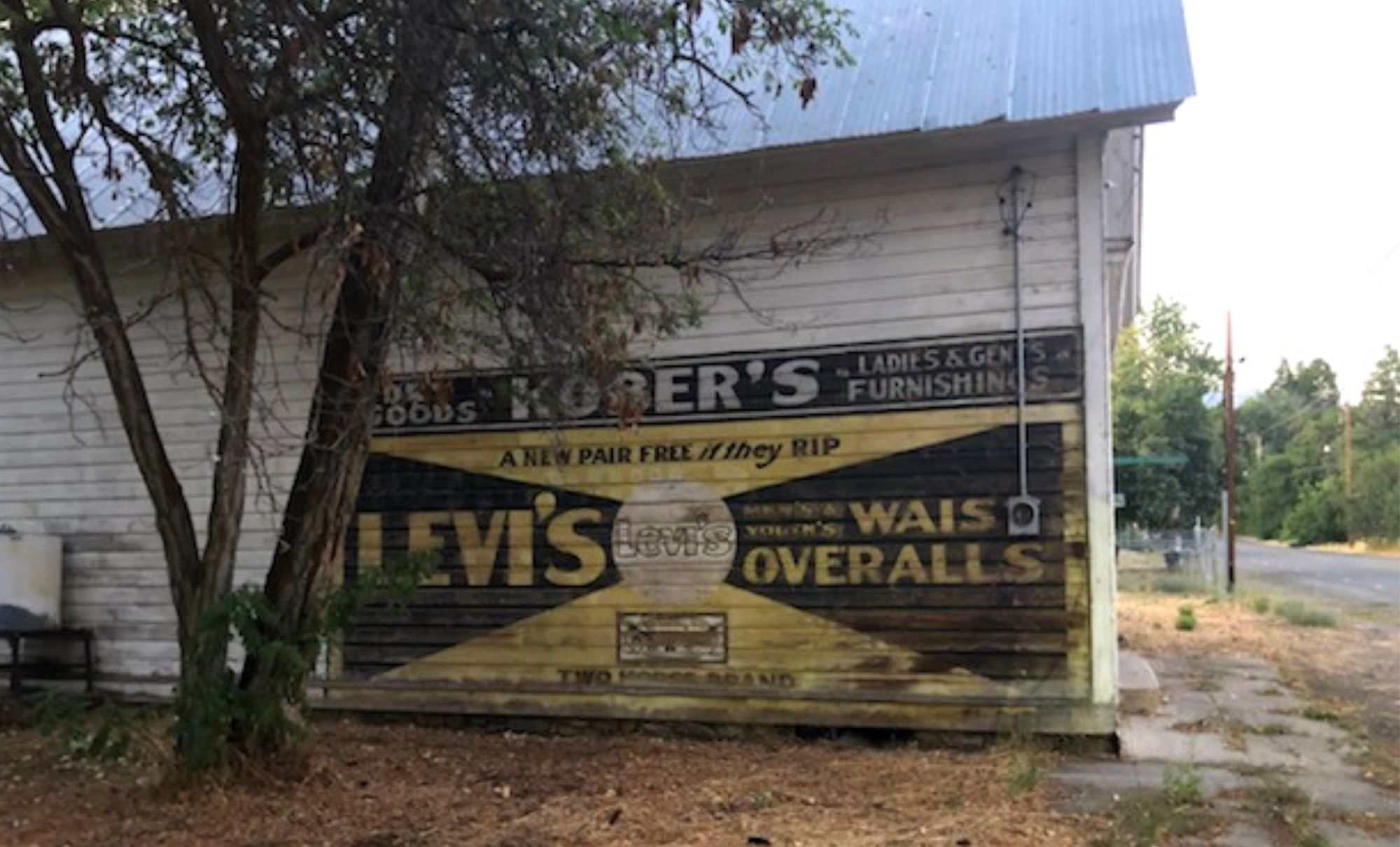 The Levi’s® ghost sign, or preserved painted building advertisement, covers a portion of the outside wall of what used to be Henry Kober & Co.’s mercantile in the tiny town of Fort Bidwell, in the northeast corner of California. Records in the Levi Strauss & Co. Archives indicate that Kober’s was a retail customer as early as 1909. Back then, folks could buy Levi’s® goods in the city or in rural locations like Fort Bidwell, established as a military post in Modoc County in 1865, with a population numbering 180 in 2020.
